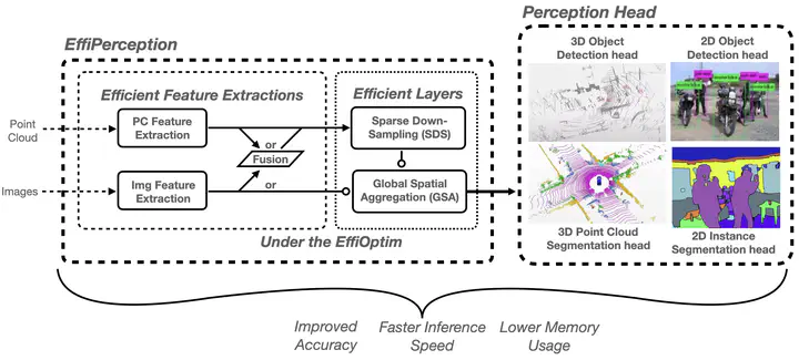 The accuracy-speed-memory trade-off is always the priority to consider for several computer vision perception tasks. Previous methods mainly focus on a single or small couple of these tasks, such as creating effective data augmentation, feature extractor, learning strategies, etc. These approaches, however, could be inherently task-specific:their proposed model performance may depend on a specific perception task or a dataset. Targeting to explore common learning patterns and increasing the module robustness, we propose the EffiPerception framework. It could achieve great accuracy-speed performance with relatively low memory cost under several perception tasks:2D Object Detection, 3D Object Detection, 2D Instance Segmentation, and 3D Point Cloud Segmentation. Overall, the framework consists of three parts:(1) Efficient Feature Extractors, which extract the input features for each modality. (2) Efficient Layers, plug-in plug-out layers that further process the feature representation, aggregating core learned information while pruning noisy proposals. (3) The EffiOptim, an 8-bit optimizer to further cut down the computational cost and facilitate performance stability. Extensive experiments on the KITTI, semantic-KITTI, and COCO datasets revealed that EffiPerception could show great accuracy-speed-memory overall performance increase within the four detection and segmentation tasks, in comparison to earlier, well-respected methods.